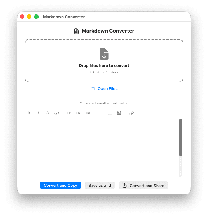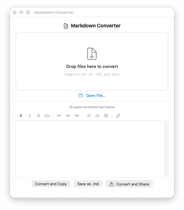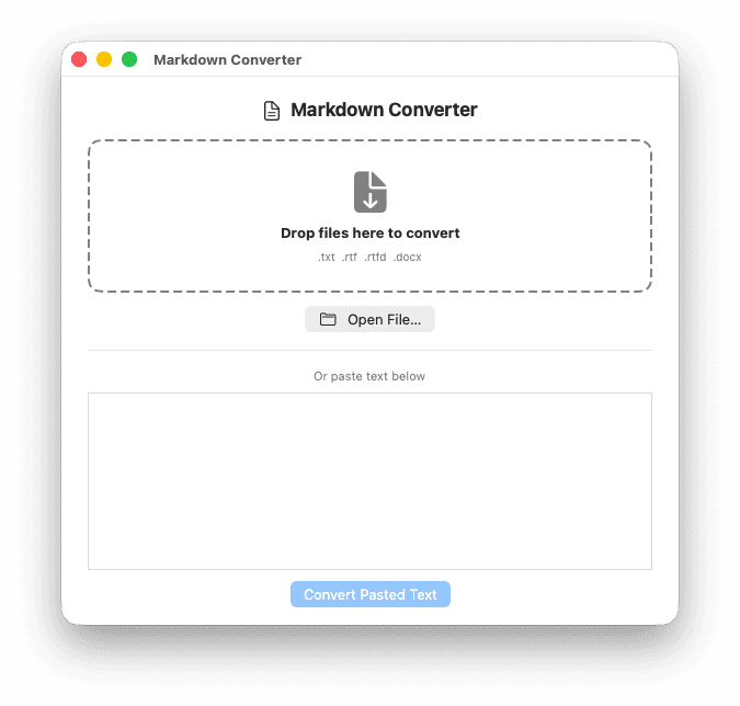 The core gesture is a drop. Drop a TXT, RTF, RTFD, DOCX, PPTX, or PDF file on the app and get a clean .md file. The entry points match how people actually work: a drop zone, a dock icon that accepts drops without opening a window, a formatting toolbar for pasting rich text directly, a recent files menu.